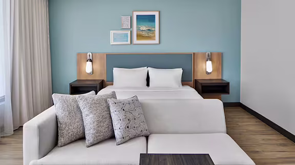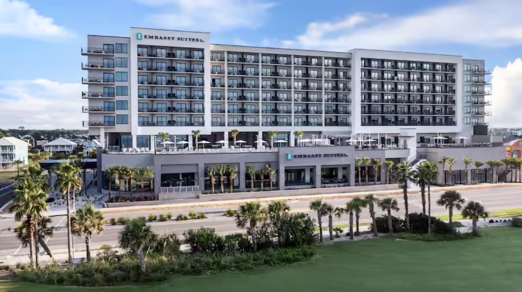 Rooms are all-suite, designed for families and longer stays, with separate living areas and modern conveniences. The property highlights complimentary made‑to‑order breakfast and a complimentary evening reception, plus a daily resort charge that includes guest internet access, bicycle rentals, two beach chairs and an umbrella, a daily s’mores kit, and beach cooler valet service. For a local tourism perspective and nearby attractions, see the Gulf Shores & Orange Beach visitor listing: https://www.gulfshores.com/lodging/resort/embassy-suites/.