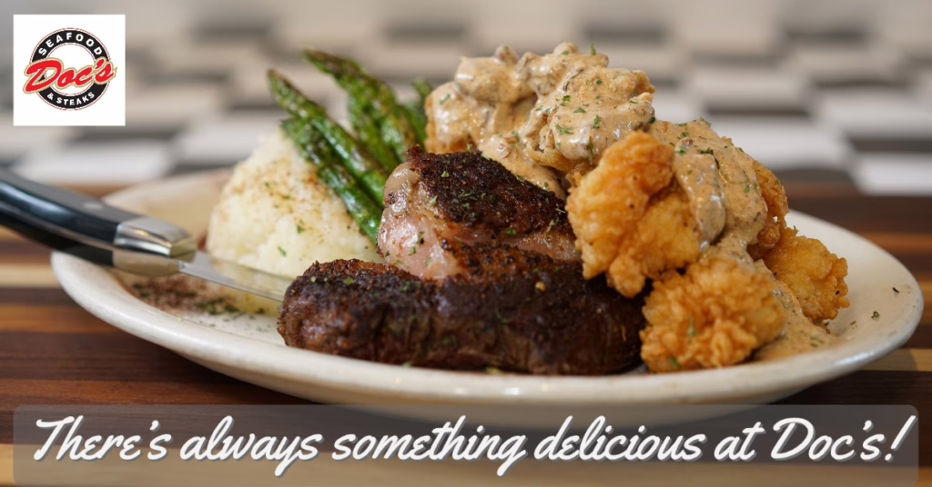 While seafood is the star, Doc’s also excels at steak. Their menu includes Ribeye, New York Strip, and Filet Mignon, all aged for 28 days to ensure tenderness and flavor. Pairing a juicy steak with Gulf shrimp creates the ultimate surf-and-turf experience. This combination makes Doc’s a versatile choice for groups where some crave seafood and others prefer steak.